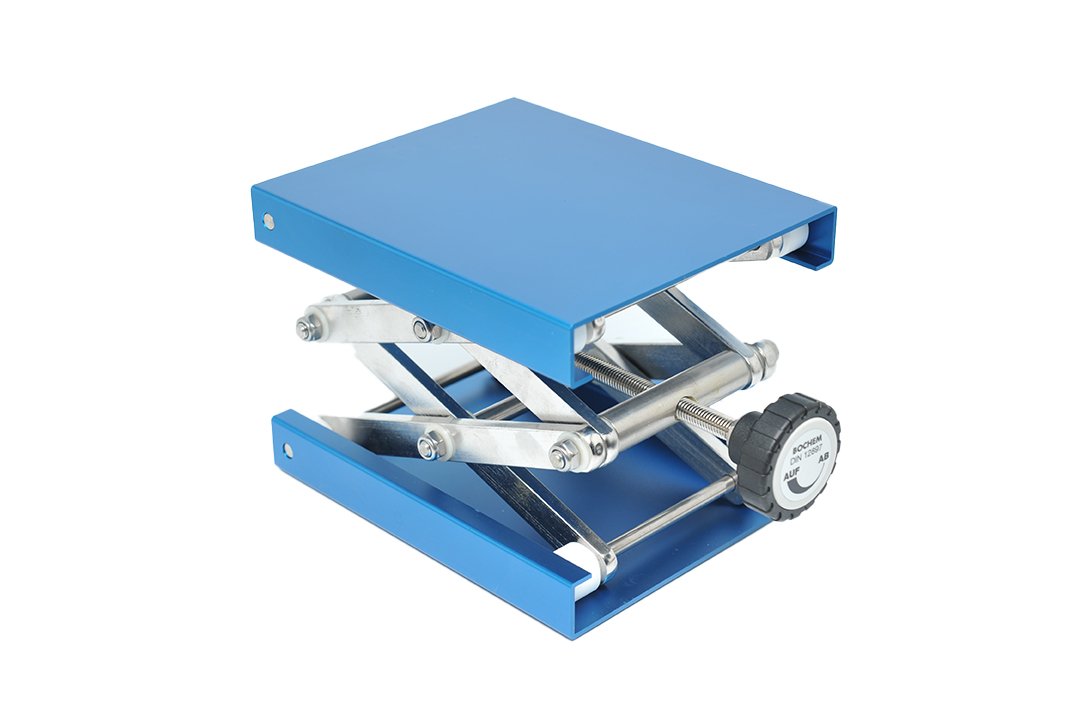 This laboratory scissor jack provides stable, height-adjustable support for hot plates, glassware, and many other items.