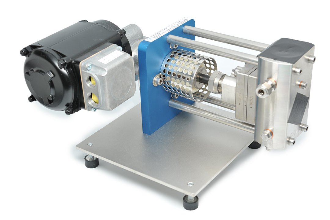 One gear rotates clockwise and the other gear counter-clockwise. The product enters the space in between the teeth and rotates with the gears towards the discharge of the pump. The pump adapter plate  can be tempered by liquid or vaporous heat carriers. The rotating drive shaft is sealed by a stuffing box containing packing rings.  The throughput of the pump can be set by changing the frequency of a connected frequency inverter.
